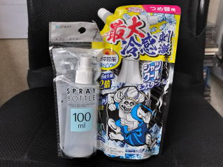 シャツクールモンスタークールの詰替用と、100円ショップでスプレーボトルを自宅用と職場用に2つ購入。