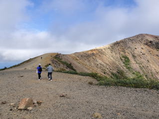 ここで引き返してしまう人も多いのですが、折角の噴火口です。お鉢回りをしましょう。(所要時間は一周40分)