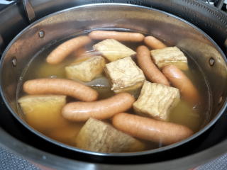 帰宅後、蓋を開けると玉葱ちゃんがまだ堅そう。玉葱だけだとさみしいので、買ってきた厚揚げとウインナーを投入し、再加熱後また保温鍋へ。
