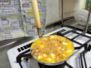 溶き卵を入れる前に丼へご飯を盛っておくことで、余分な蒸気を飛ばしておきます。
