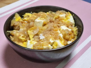 やや濃いめの味になるようめんつゆを入れ、さいの目切りにした豆腐を投入してまた煮る。